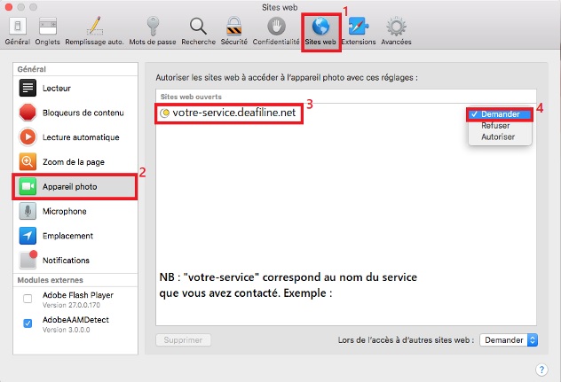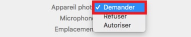 - Caméra : Cliquez sur le bouton « Demander », le site web peut alors utiliser votre caméra